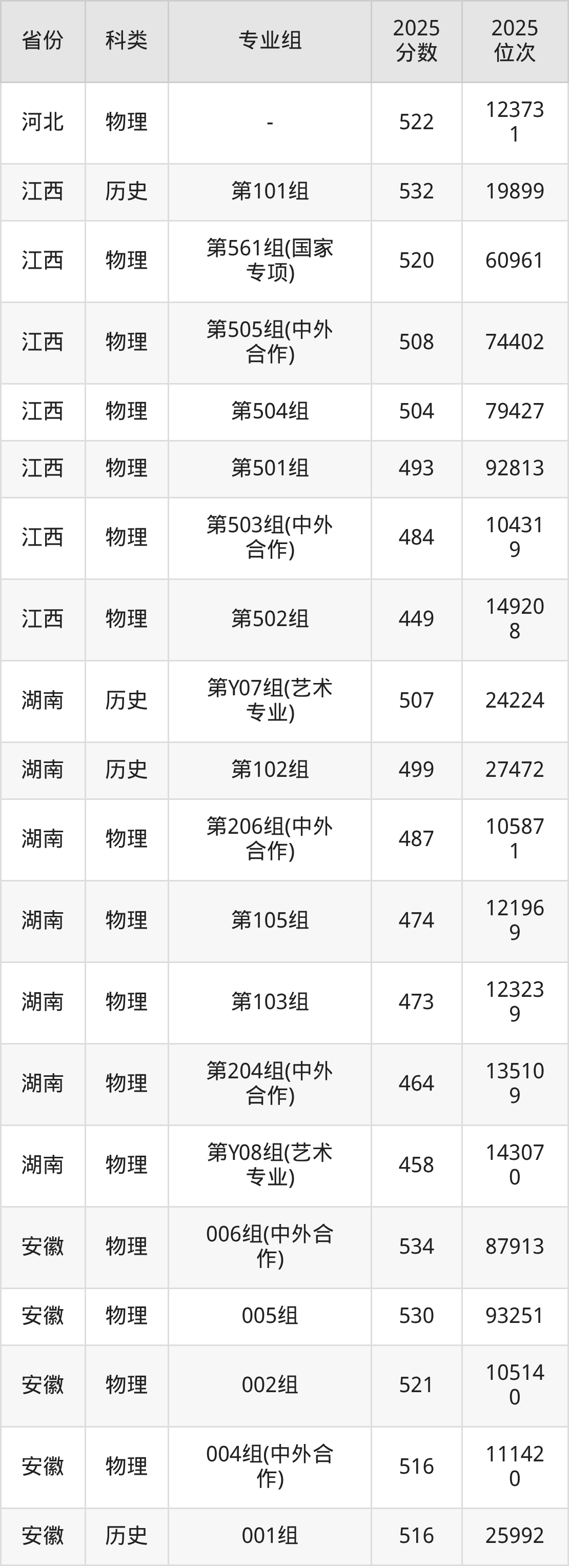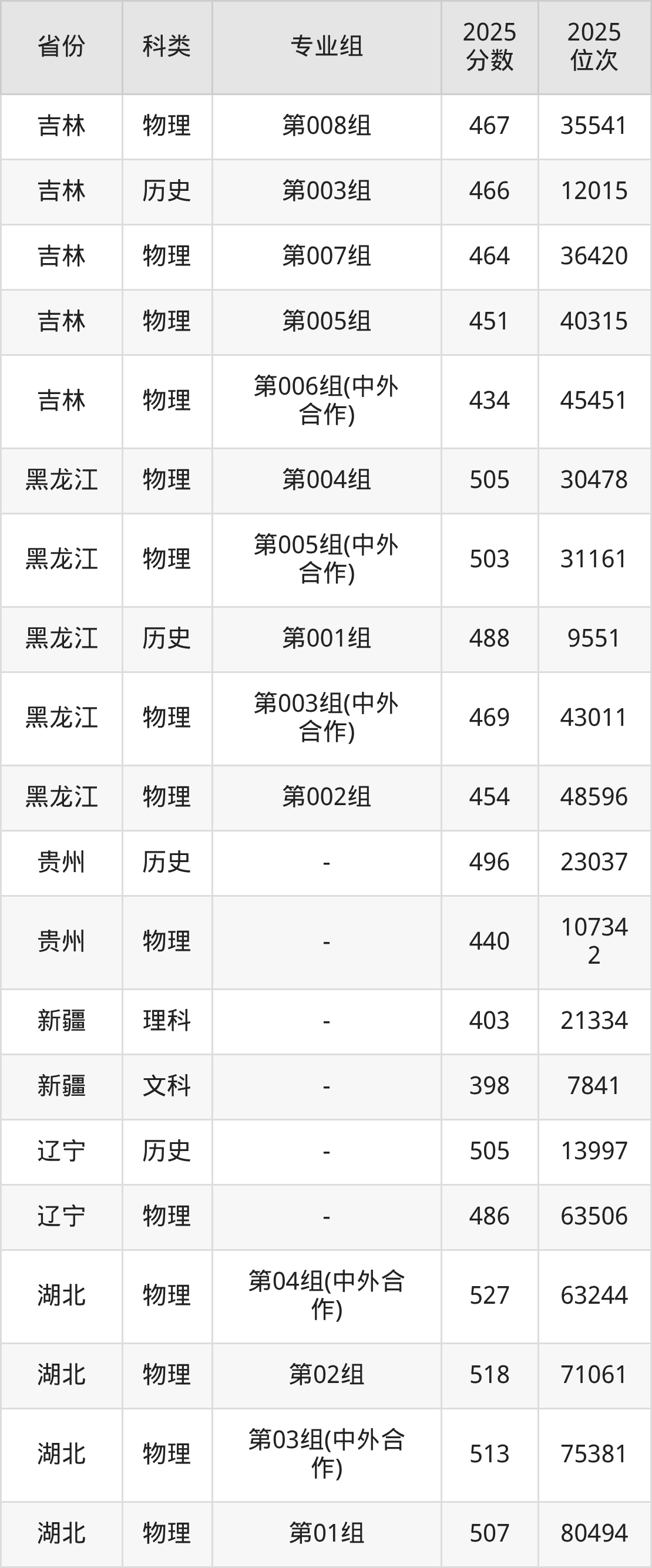 2025長(zhǎng)春工業(yè)大學(xué)在各省錄取最低分在398分到563分之間不等,其中分?jǐn)?shù)門檻最低的是新疆,最高的是海南。下面展示長(zhǎng)春工業(yè)大學(xué)錄取分?jǐn)?shù)線最低的5個(gè)省份(含最低分專業(yè)組及位次):