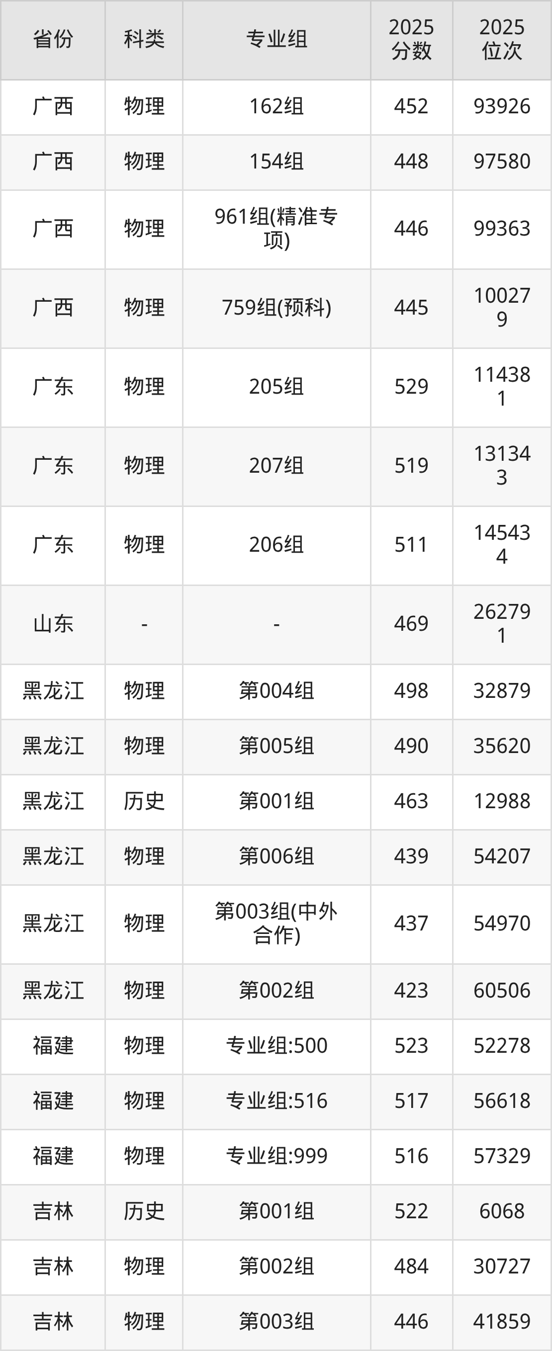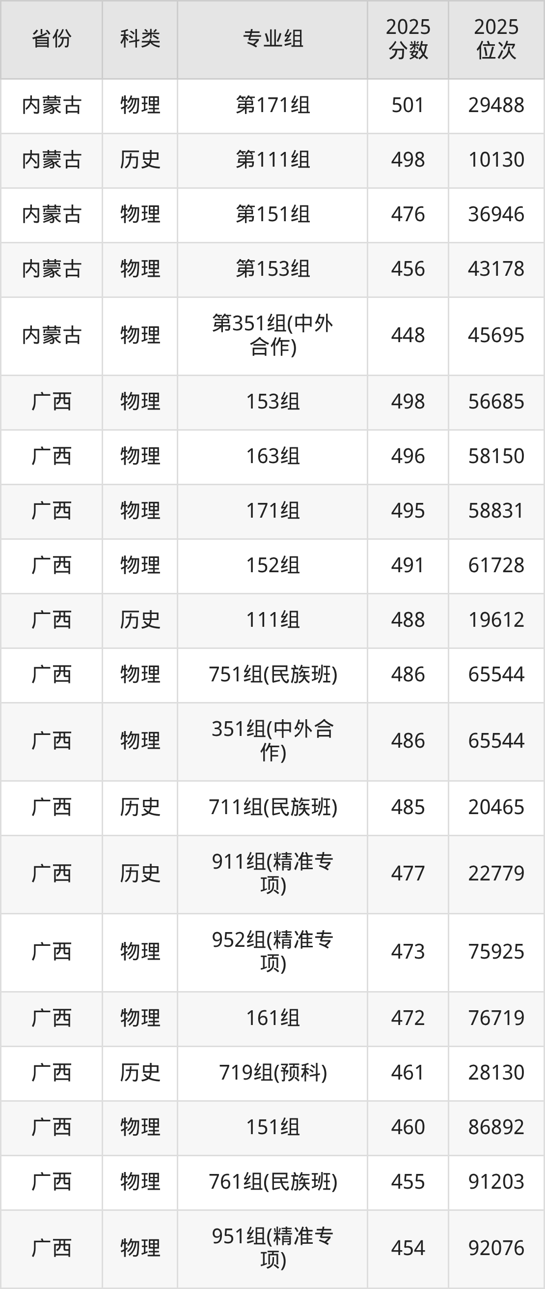 3、廣西:最低分445分,對應(yīng)最低分專業(yè)組為物理類759組(預(yù)科),位次100279名;