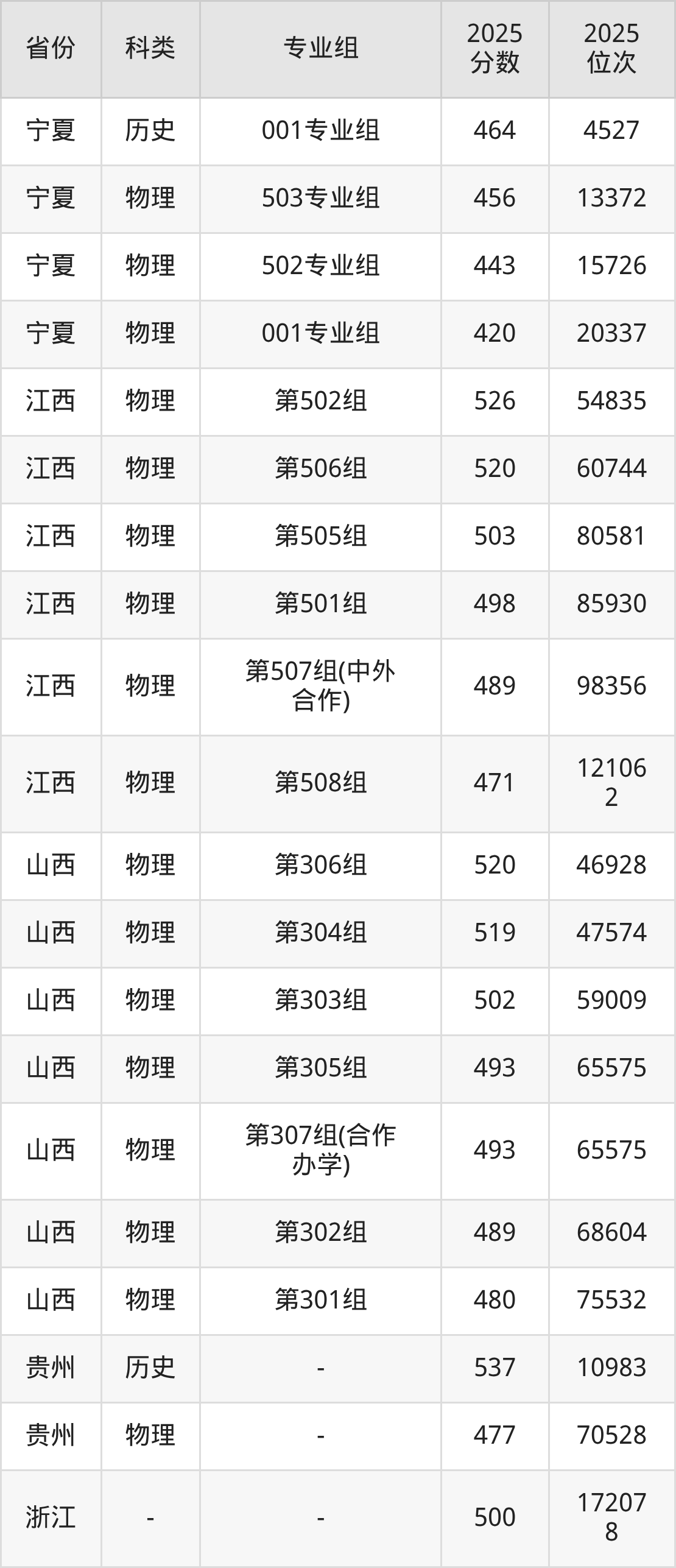 1、寧夏:最低分420分,對應(yīng)最低分專業(yè)組為物理類001專業(yè)組,位次20337名;