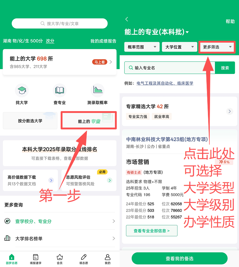 解決方案:圓夢志愿“輸入分?jǐn)?shù),查能上的大學(xué)”功能,為你提供所有可報(bào)考的優(yōu)質(zhì)院校名單。你可以通過篩選城市、學(xué)校類別,快速找到最適合你的大學(xué)。