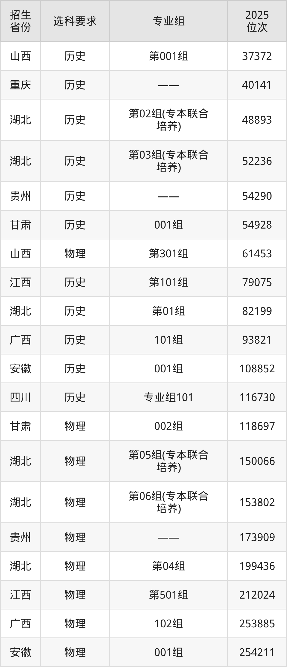 湖北幼兒師范高等??茖W校2025年在全國各省的位次差異較大,最高位次是37372位(山西歷史類)、最低位次是284151位(四川物理類)。各省具體位次請看下圖: