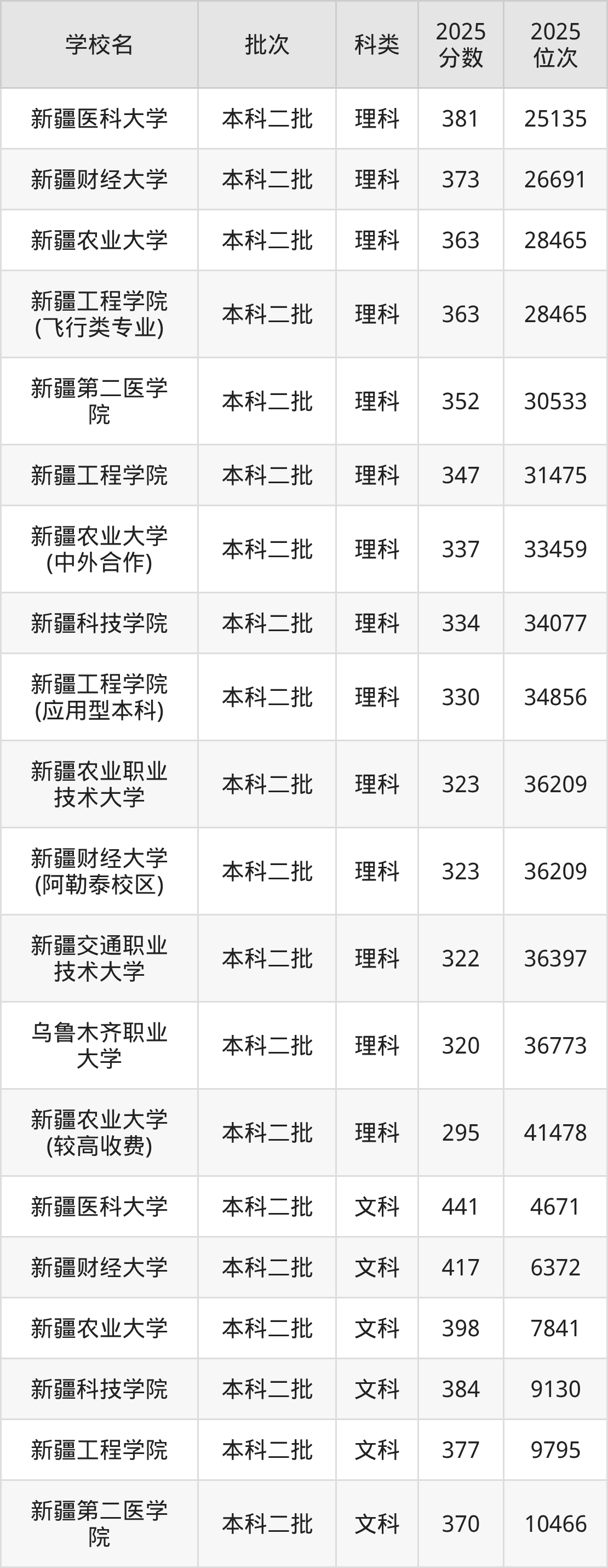 下面是2025年新疆理科大學(xué)最低錄取分?jǐn)?shù)線(xiàn)一覽表: