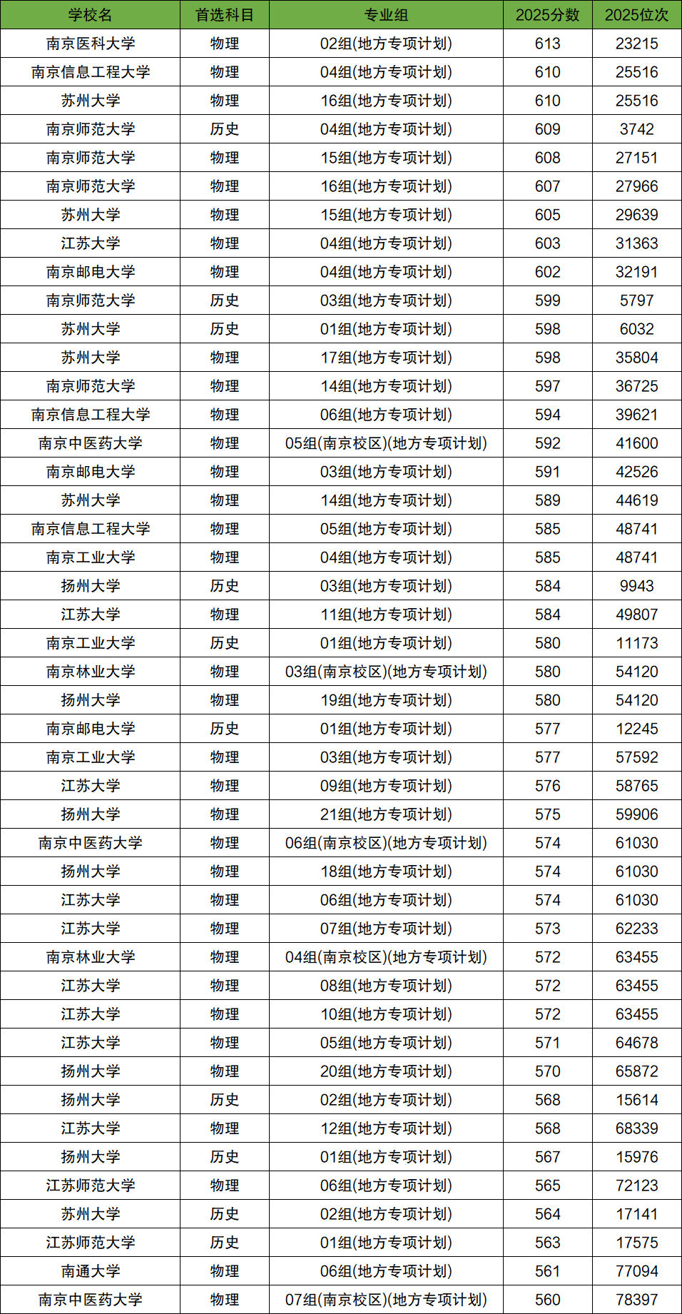 下面是2025年江蘇地方專項(xiàng)計(jì)劃錄取分?jǐn)?shù)線一覽表: