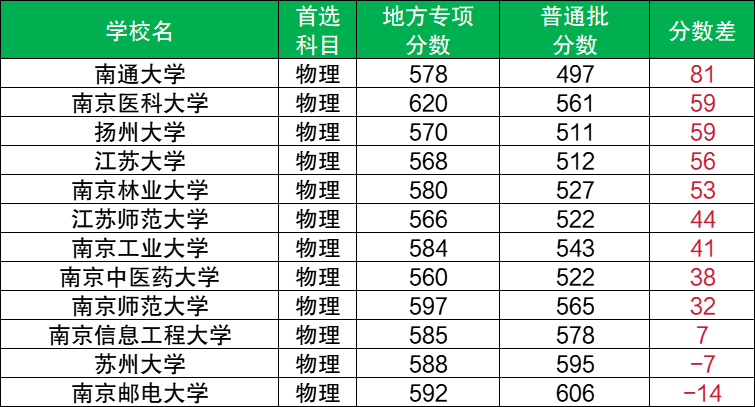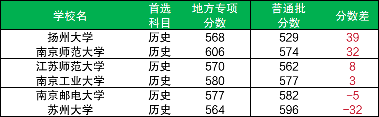 如物理類南通大學地方專項計劃比普通類高81分錄取、歷史類揚州大學地方專項計劃比普通類高39分錄取等,更多院校錄取分數(shù)詳情見下文。