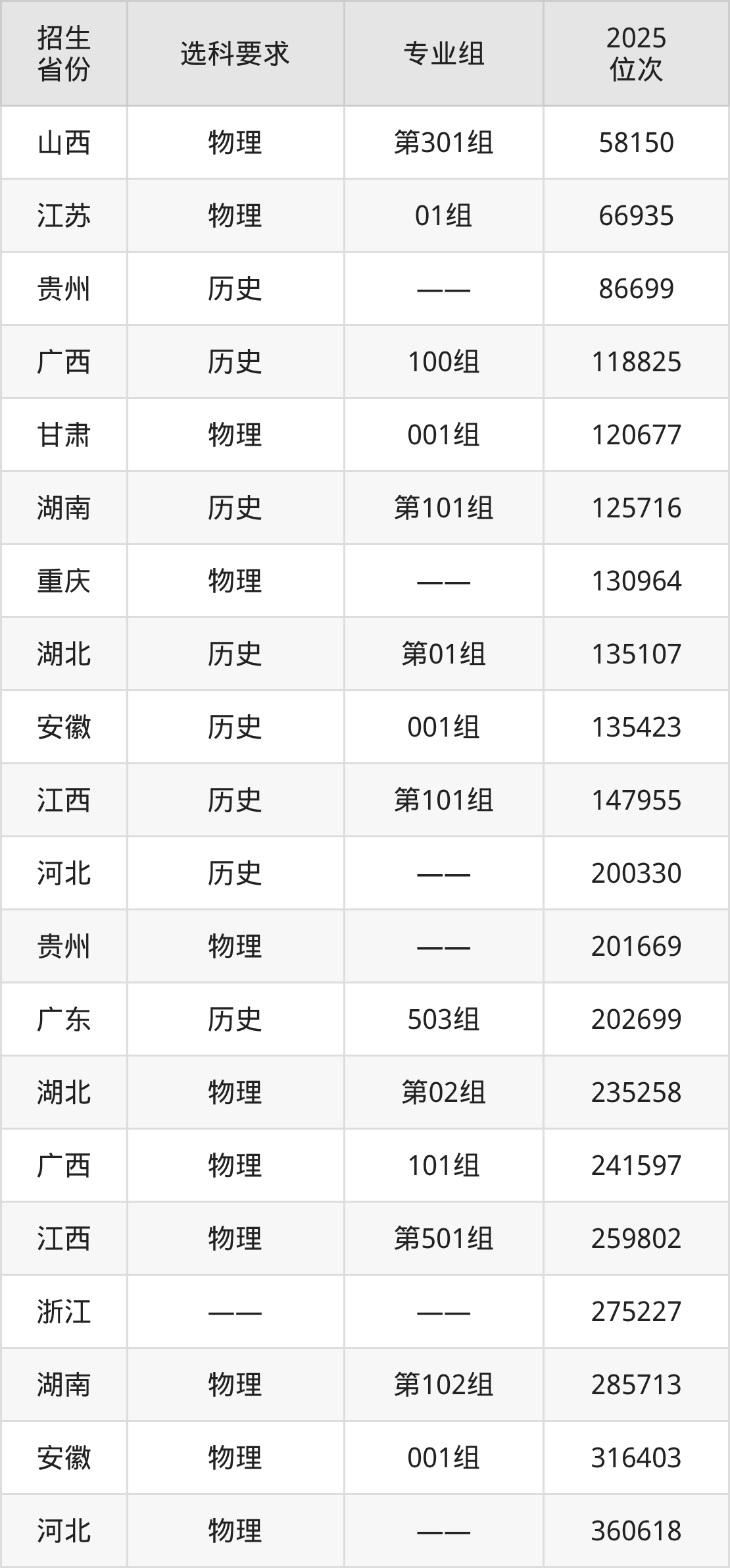 贛西科技職業(yè)學(xué)院2025年在全國(guó)各省的位次差異較大,最高位次是58150位(山西物理類)、最低位次是669307位(山東)。各省具體位次請(qǐng)看下圖: