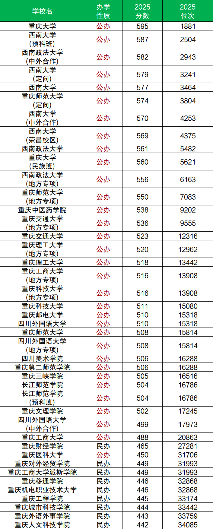 三、2025重慶本科大學(xué)錄取分?jǐn)?shù)線及位次