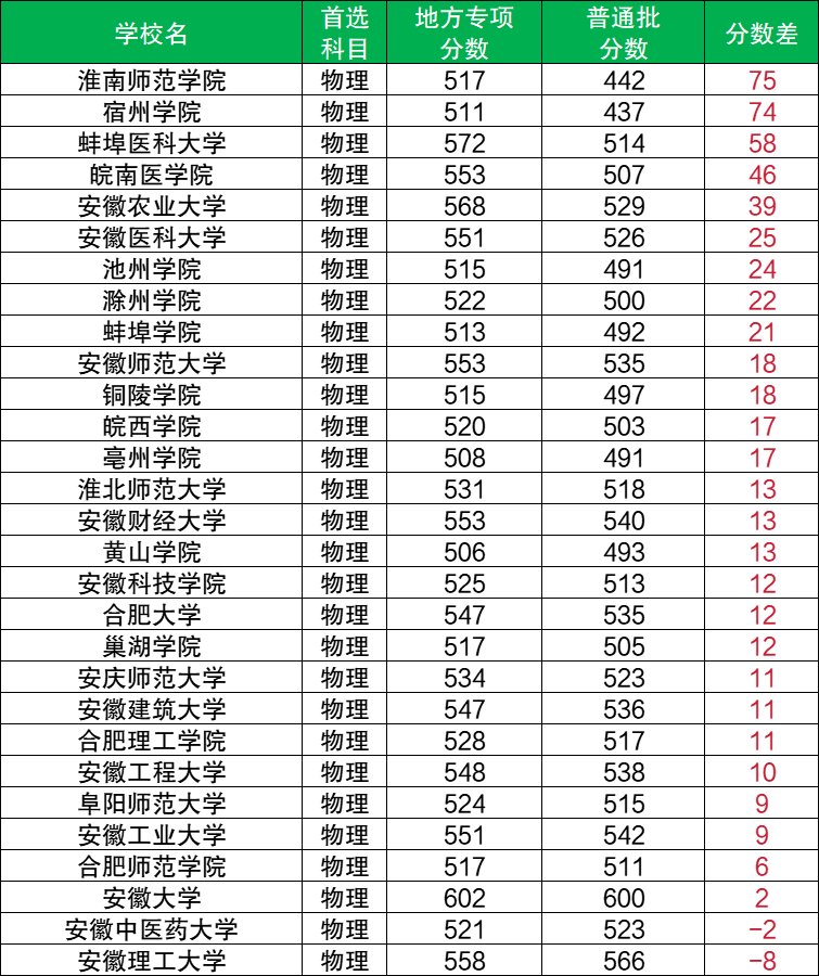 通過(guò)和普通批最低分進(jìn)行對(duì)比可知,安徽地方專(zhuān)項(xiàng)計(jì)劃物理類(lèi)可降分錄取的大學(xué)有2所,分別為安徽理工大學(xué)(降8分)、安徽中醫(yī)藥大學(xué)(降2分)。其余28所院校均為高分錄取,如淮南師范學(xué)院(超75分)、宿州學(xué)院(超74分)、蚌埠醫(yī)科大學(xué)(超58分)等,最高超普通批75分錄取。