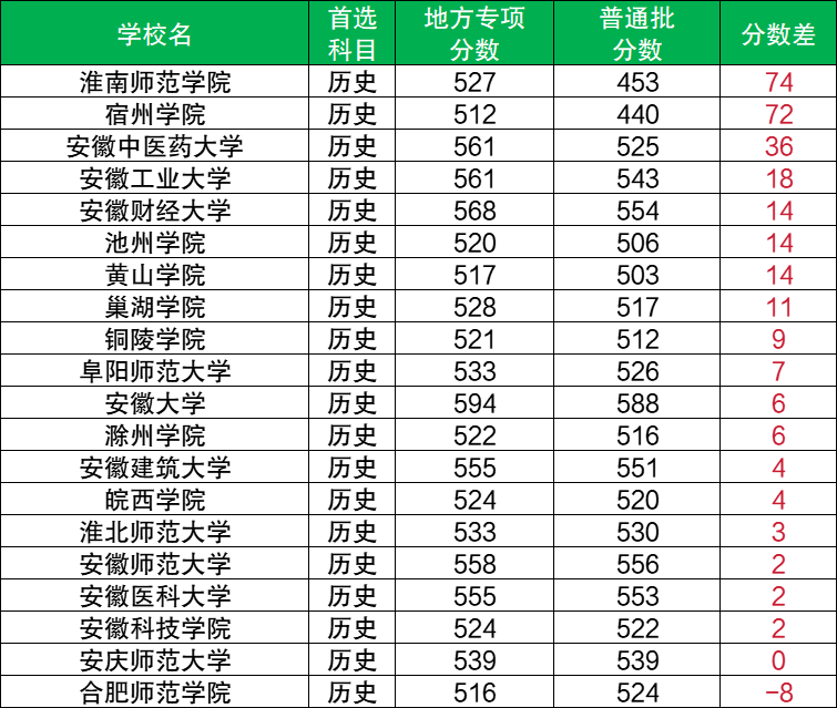 通過(guò)和普通批最低分進(jìn)行對(duì)比可知,安徽地方專(zhuān)項(xiàng)計(jì)劃歷史類(lèi)可降分錄取的大學(xué)有1所,為合肥師范學(xué)院(降8分)。其余19所院校均為高分錄取,如淮南師范學(xué)院(超74分)、宿州學(xué)院(超72分)、安徽中醫(yī)藥大學(xué)(超36分)等,最高超普通批74分錄取。