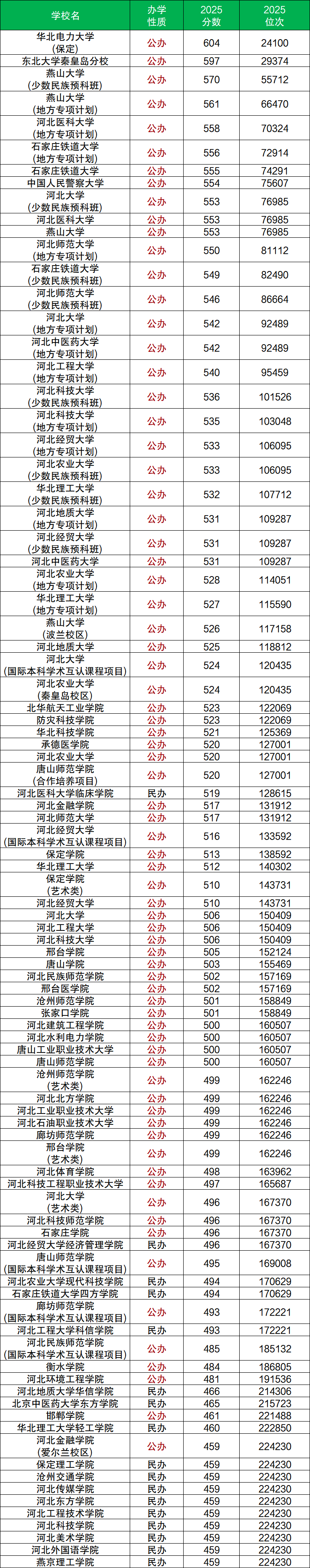 以河北省物理類高考數(shù)據(jù)為例,2025年河北本科大學(xué)在省內(nèi)招生,錄取分數(shù)線最高的是華北電力大學(xué)(保定),分數(shù)線為604分,對應(yīng)最低位次24100名。其次是東北大學(xué)秦皇島分校,分數(shù)線為597分,對應(yīng)最低位次29374名。