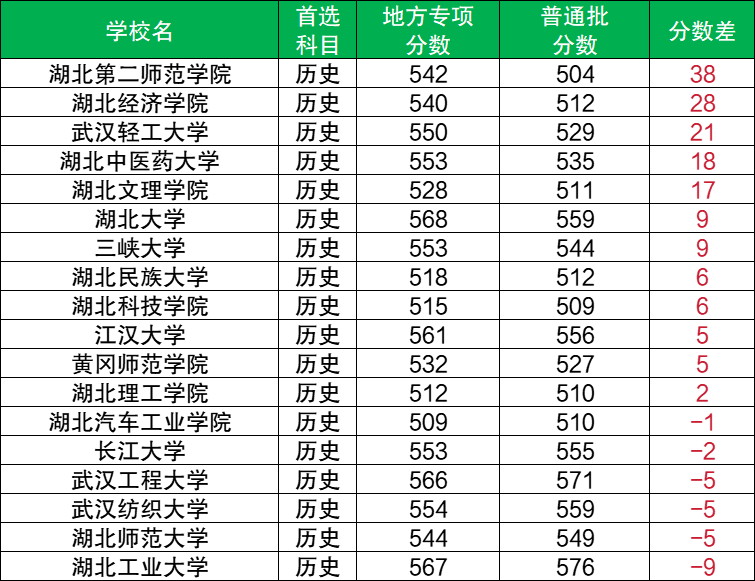 如物理類湖北理工學(xué)院地方專項(xiàng)計(jì)劃比普通類高30分錄取、歷史類湖北第二師范學(xué)院地方專項(xiàng)計(jì)劃比普通類高38分錄取等,更多院校錄取分?jǐn)?shù)詳情見下文。