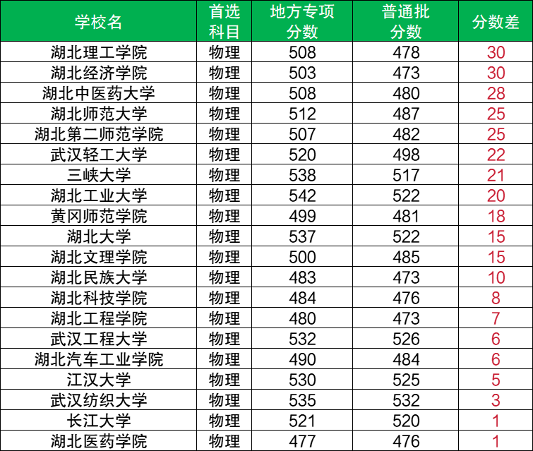 通過和普通批最低分進(jìn)行對(duì)比可知,湖北地方專項(xiàng)計(jì)劃物理類沒有降分錄取的大學(xué),所有院校分?jǐn)?shù)均超普通批1分-30分不等,如湖北理工學(xué)院(超30分)、湖北經(jīng)濟(jì)學(xué)院(超30分)、湖北中醫(yī)藥大學(xué)(超28分)等。