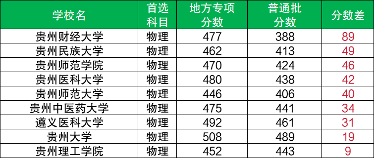 通過和普通批最低分進(jìn)行對比可知,貴州地方專項計劃物理類沒有降分錄取的大學(xué),各校分?jǐn)?shù)超普通批9分-89分不等,如貴州財經(jīng)大學(xué)(超89分)、貴州民族大學(xué)(超49分)、貴州師范學(xué)院(超46分)等。