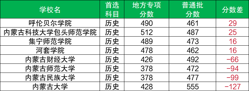通過(guò)和普通批最低分進(jìn)行對(duì)比可知,內(nèi)蒙古地方專(zhuān)項(xiàng)計(jì)劃歷史類(lèi)可降分錄取的大學(xué)有4所,分別為內(nèi)蒙古大學(xué)(降127分)、內(nèi)蒙古民族大學(xué)(降99分)、內(nèi)蒙古師范大學(xué)(降94分)、內(nèi)蒙古財(cái)經(jīng)大學(xué)(降66分)。其他院校均為高分錄取,如呼倫貝爾學(xué)院(超29分)、內(nèi)蒙古科技大學(xué)包頭師范學(xué)院(超25分)、集寧師范學(xué)院(超16分)等。