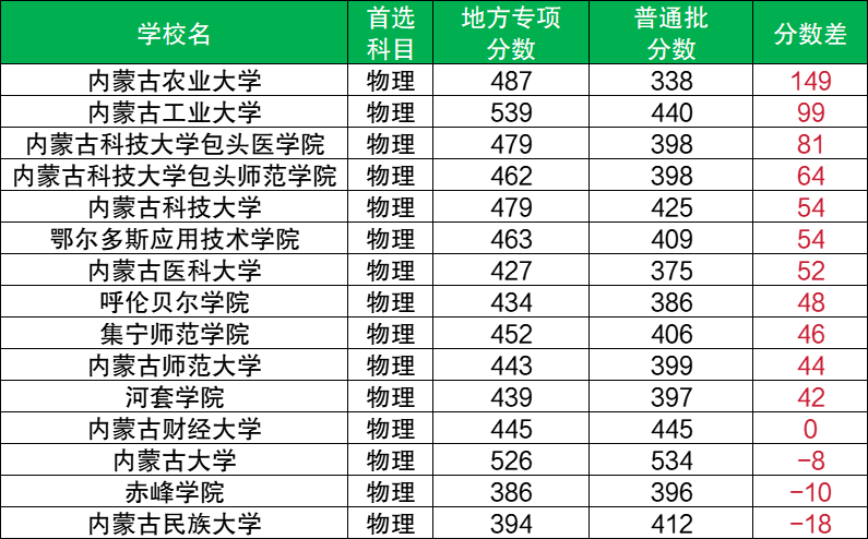 2、并非必然降分:部分熱門(mén)院?;?qū)I(yè)的地方專(zhuān)項(xiàng)計(jì)劃錄取分?jǐn)?shù)高于普通批次,例如內(nèi)蒙古農(nóng)業(yè)大學(xué)的地方專(zhuān)項(xiàng)計(jì)劃物理類(lèi)分?jǐn)?shù)(487分)比普通批(338分)高149分、內(nèi)蒙古工業(yè)大學(xué)的地方專(zhuān)項(xiàng)計(jì)劃物理類(lèi)分?jǐn)?shù)(539分)比普通批(440分)高99分。這通常是因?yàn)閳?bào)考人數(shù)多,競(jìng)爭(zhēng)變得更為激烈。