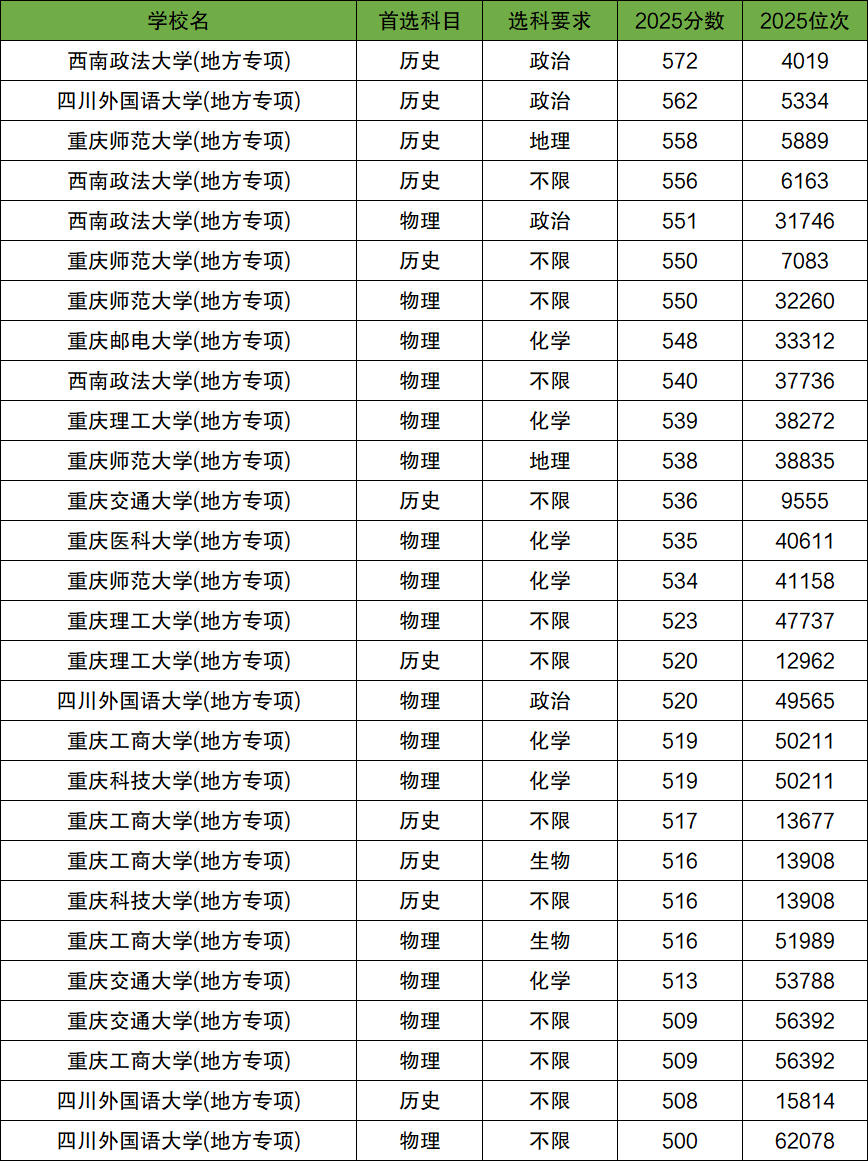 2025年重慶地方專項(xiàng)計(jì)劃的分?jǐn)?shù)線為:500分-572分,其中,歷史類508分-572分、物理類500分-551分。