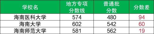 如海南醫(yī)科大學(xué)地方專項(xiàng)計(jì)劃比普通類高94分錄取、海南大學(xué)地方專項(xiàng)計(jì)劃比普通類高60分錄取等,更多院校錄取分?jǐn)?shù)詳情見下文。