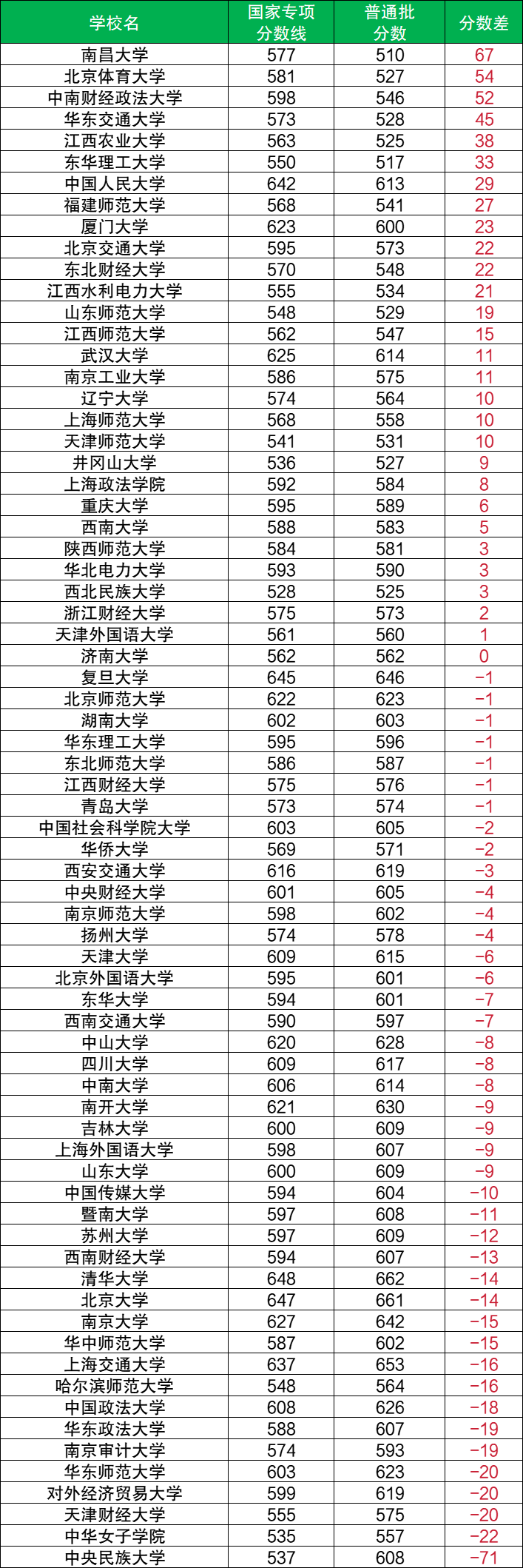 2025年江西省高校國(guó)家專(zhuān)項(xiàng)計(jì)劃錄取分?jǐn)?shù)與普通批次分?jǐn)?shù)的對(duì)比情況顯示,部分大學(xué)有降分優(yōu)惠: