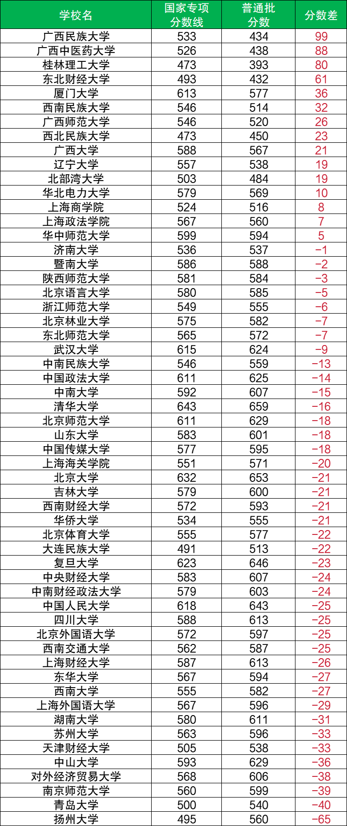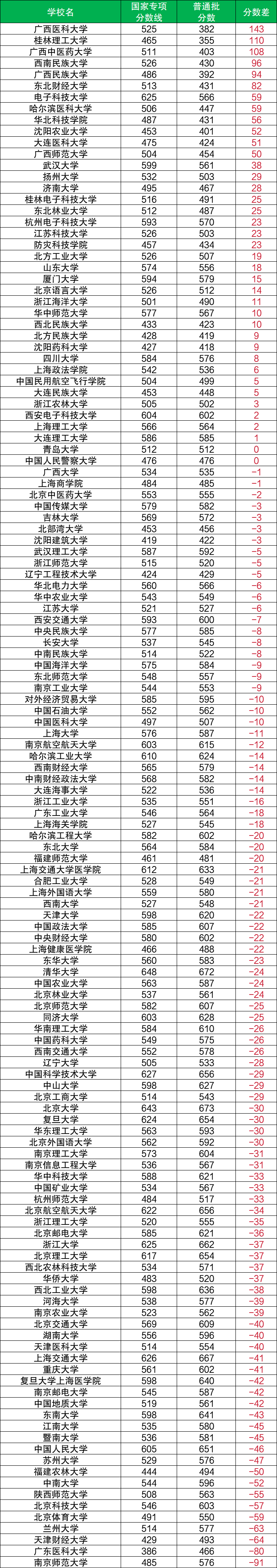 2025年廣西高校國(guó)家專項(xiàng)計(jì)劃錄取分?jǐn)?shù)與普通批次分?jǐn)?shù)的對(duì)比情況顯示,部分大學(xué)有降分優(yōu)惠: