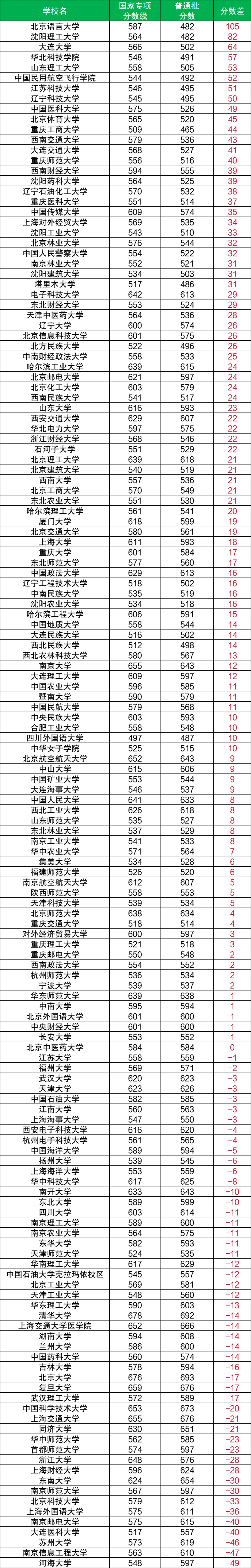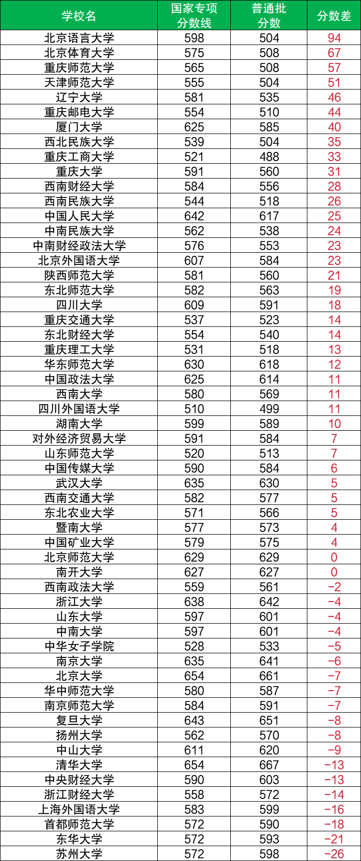 2、并非必然降分:多數(shù)院校的國家專項(xiàng)計(jì)劃錄取分?jǐn)?shù)高于普通批次,例如物理類北京語言大學(xué)的國家專項(xiàng)分?jǐn)?shù)線(587分)比普通批(482分)高105分、歷史類北京語言大學(xué)的國家專項(xiàng)分?jǐn)?shù)線(598分)比普通批(504分)高94分。這通常是因?yàn)閳?bào)考人數(shù)多,競爭變得更為激烈。