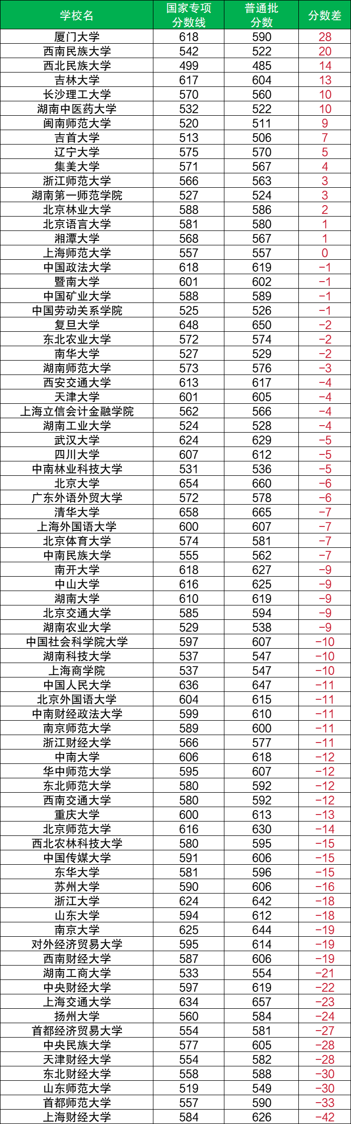 通過和普通批最低分進行對比可知,湖南國家專項計劃歷史類可降分錄取的大學(xué)有61所,降分幅度從1分到42分不等,如上海財經(jīng)大學(xué)(降42分)、首都師范大學(xué)(降33分)、東北財經(jīng)大學(xué)(降30分)等。其余院校為高分錄取,如廈門大學(xué)(超28分)、西南民族大學(xué)(超20分)、西北民族大學(xué)(超14分)等,最高超普通批28分錄取。