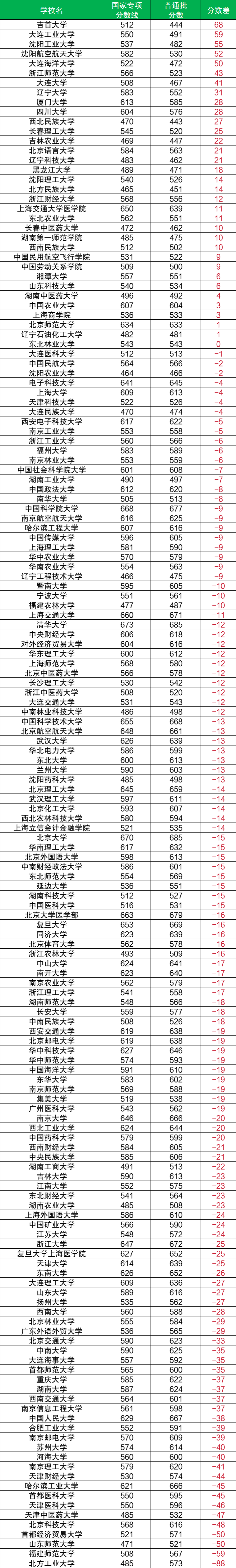 2、并非必然降分:多數(shù)院校的國家專項計劃錄取分數(shù)高于普通批次,例如物理類吉首大學(xué)的國家專項分數(shù)線(512分)比普通批(444分)高68分、歷史類廈門大學(xué)的國家專項分數(shù)線(618分)比普通批(590分)高28分。這通常是因為報考人數(shù)多,競爭變得更為激烈。