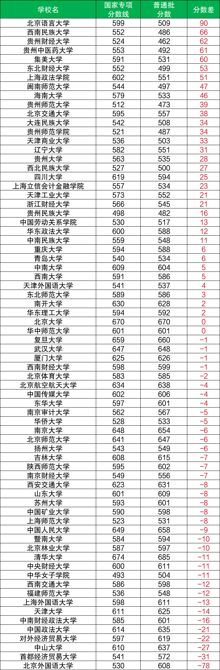2、并非必然降分:多數院校的國家專項計劃錄取分數高于普通批次,例如物理類哈爾濱醫(yī)科大學的國家專項分數線(583分)比普通批(456分)高127分、歷史類北京語言大學的國家專項分數線(599分)比普通批(509分)高90分。這通常是因為報考人數多,競爭變得更為激烈。