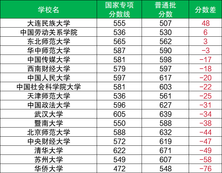 2、并非必然降分:多數(shù)院校的國家專項(xiàng)計劃錄取分?jǐn)?shù)高于普通批次,例如物理類四川大學(xué)的國家專項(xiàng)分?jǐn)?shù)線(575分)比普通批(422分)高153分、歷史類大連民族大學(xué)的國家專項(xiàng)分?jǐn)?shù)線(555分)比普通批(507分)高48分。這通常是因?yàn)閳罂既藬?shù)多,競爭變得更為激烈。