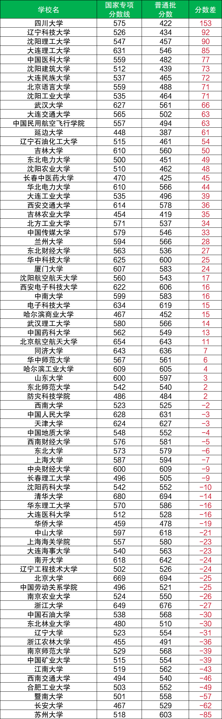 如物理類四川大學(xué)國家專項(xiàng)計劃比普通類還高153分錄取、歷史類大連民族大學(xué)國家專項(xiàng)計劃比普通類高48分錄取等,更多院校錄取分?jǐn)?shù)詳情見下文。