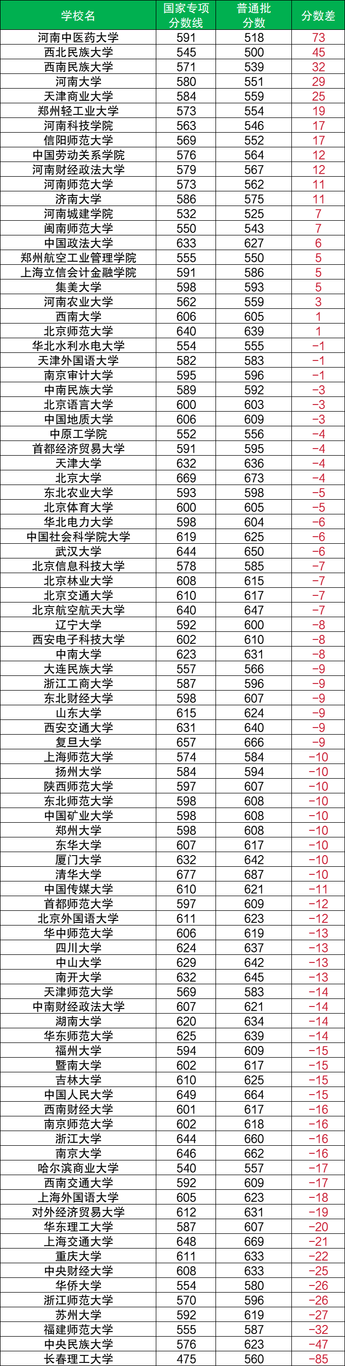 2025年河南省高校國家專項計劃錄取分?jǐn)?shù)與普通批次分?jǐn)?shù)的對比情況顯示,部分大學(xué)有降分優(yōu)惠: