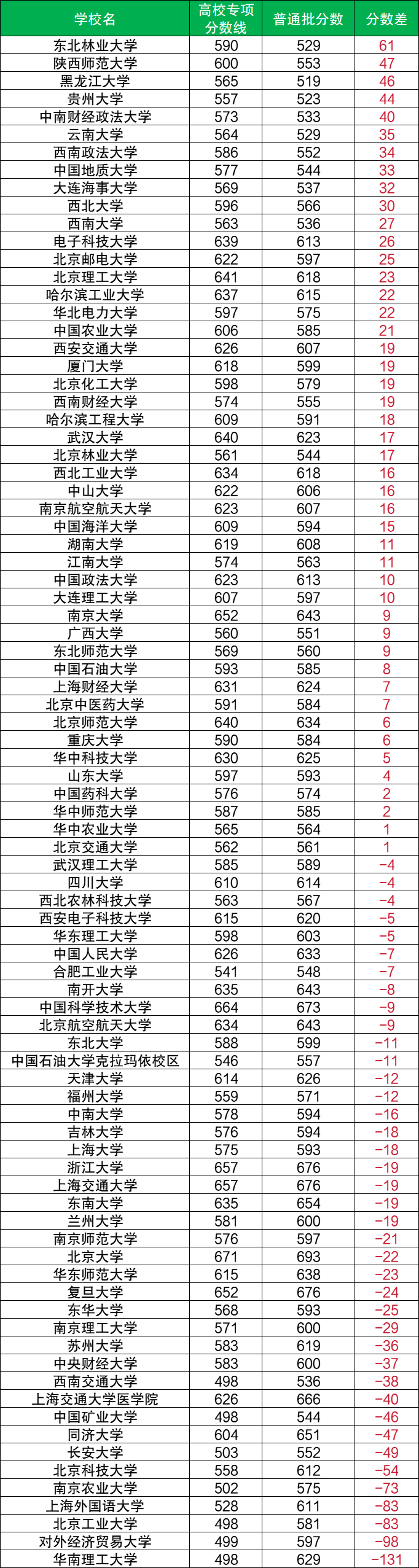 如物理類東北林業(yè)大學(xué)高校專項計劃比普通類還高61分錄取、歷史類貴州大學(xué)高校專項計劃比普通類高42分錄取等,更多院校錄取分數(shù)詳情見下文。