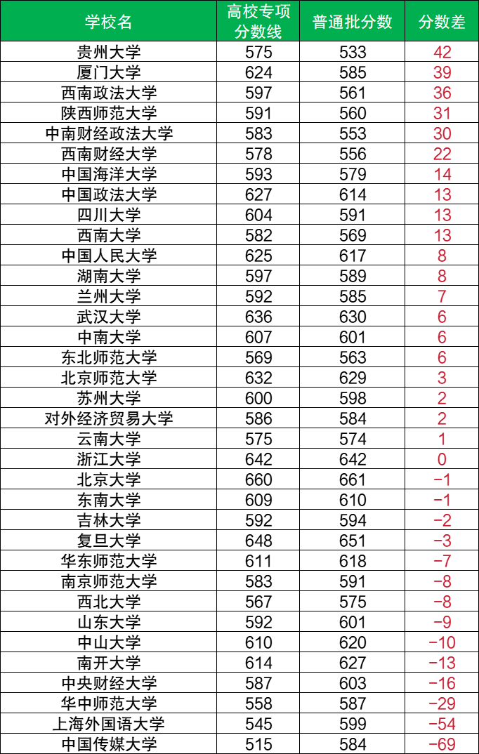 2、并非必然降分:部分院校的高校專項計劃錄取分數(shù)高于普通批次,例如物理類東北林業(yè)大學(xué)的高校專項分數(shù)線(590分)比普通批(529分)高61分、歷史類貴州大學(xué)的高校專項分數(shù)線(575分)比普通批(533分)高42分。這通常是因為報考人數(shù)多,競爭變得更為激烈。