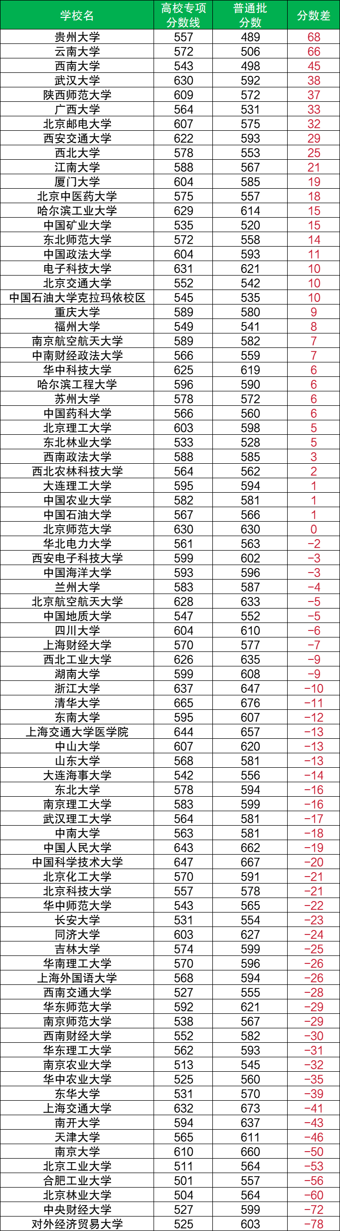 2、并非必然降分:多數(shù)院校的高校專項計劃錄取分?jǐn)?shù)高于普通批次,例如物理類貴州大學(xué)的高校專項分?jǐn)?shù)線(557分)比普通批(489分)高68分、歷史類貴州大學(xué)的高校專項分?jǐn)?shù)線(578分)比普通批(535分)高43分。這通常是因為報考人數(shù)多,競爭變得更為激烈。
