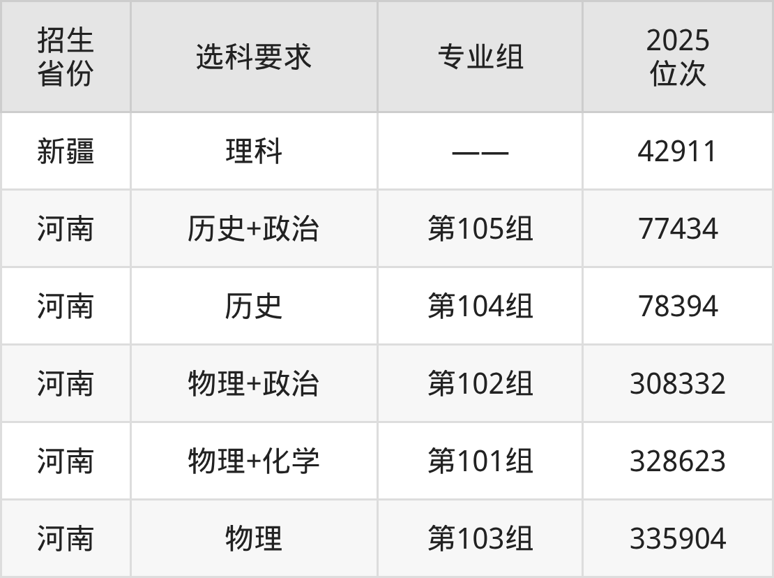 黃河交通學(xué)院2025年在全國(guó)各省的位次差異較大,最高位次是42911位(新疆理科)、最低位次是335904位(河南物理類(lèi))。各省具體位次請(qǐng)看下圖: