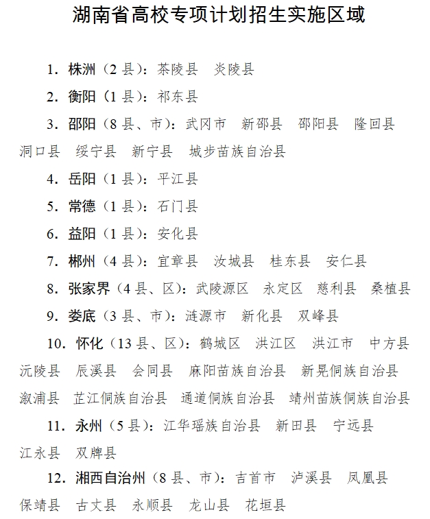 2026年湖南省高校專項計劃實施區(qū)域一共有51個,包括武岡市、新邵縣、邵陽縣等。具體名單如下: