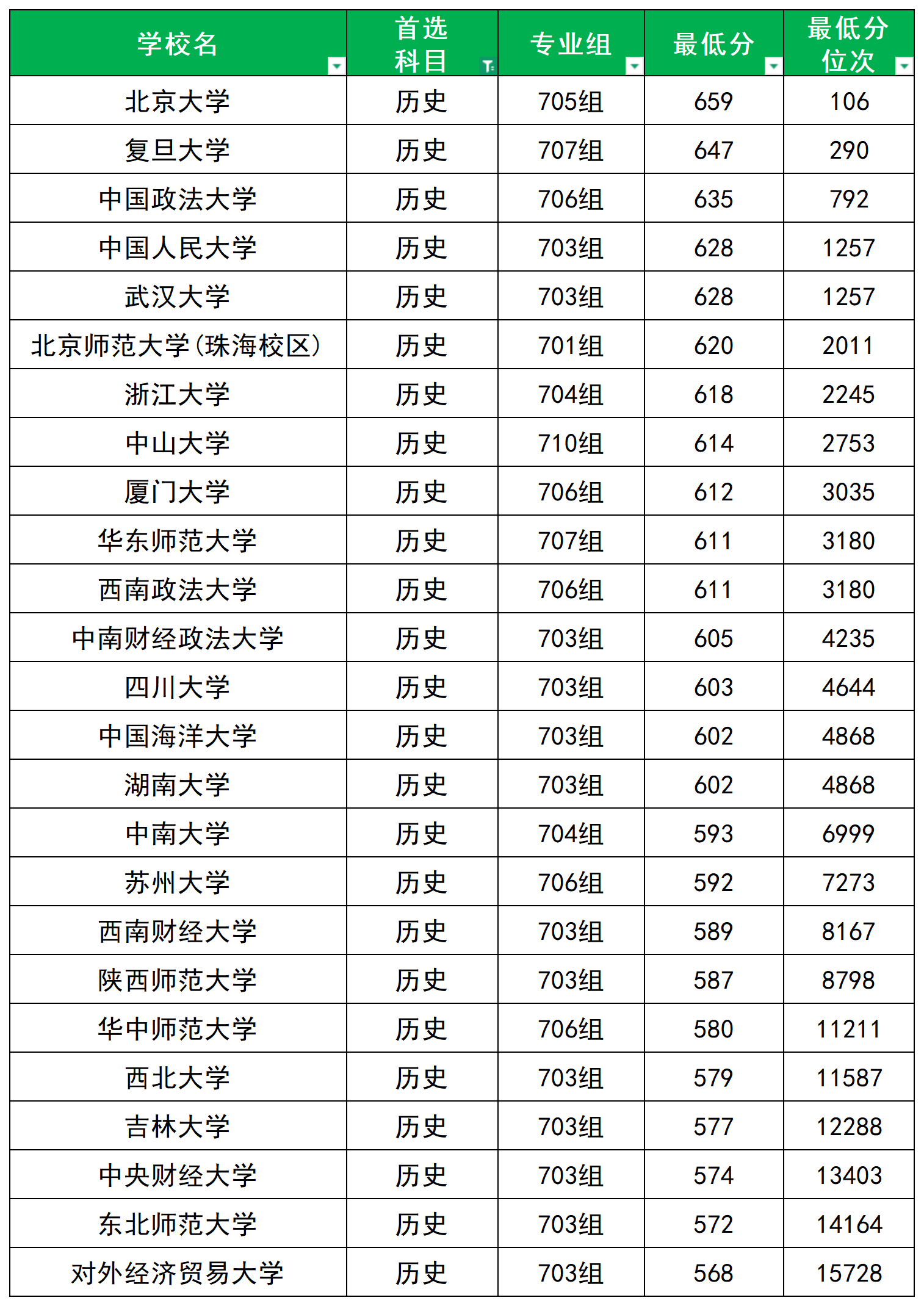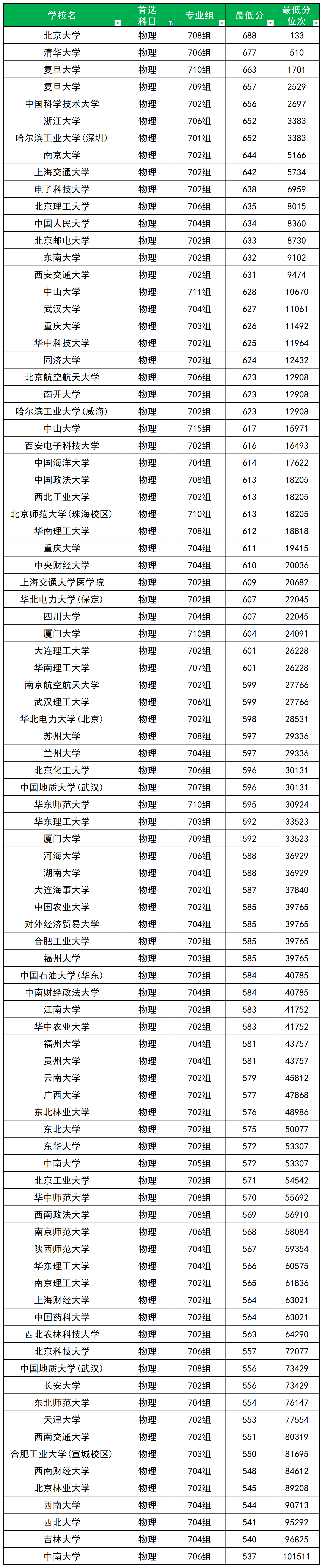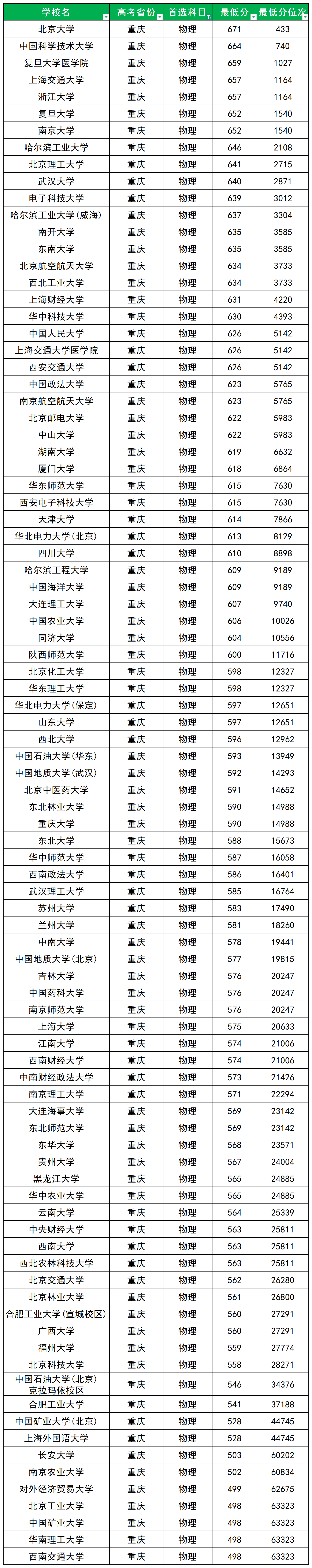 收分最高的院校為北京大學,最低分671,對應位次433;收分最低的院校為華南理工大學,最低分498,對應位次63323。