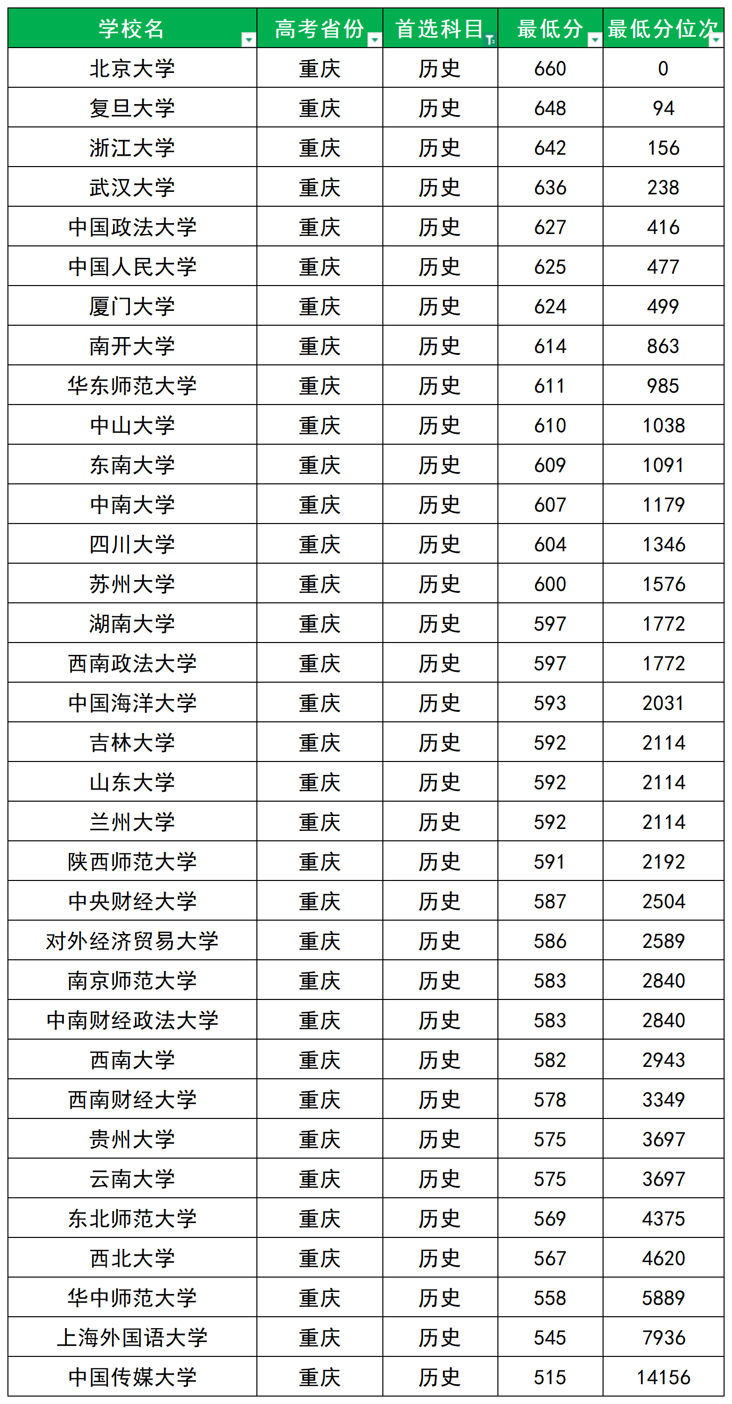 收分最高的院校為北京大學,最低分660;收分最低的院校為中國傳媒大學,最低分515,對應位次14156。