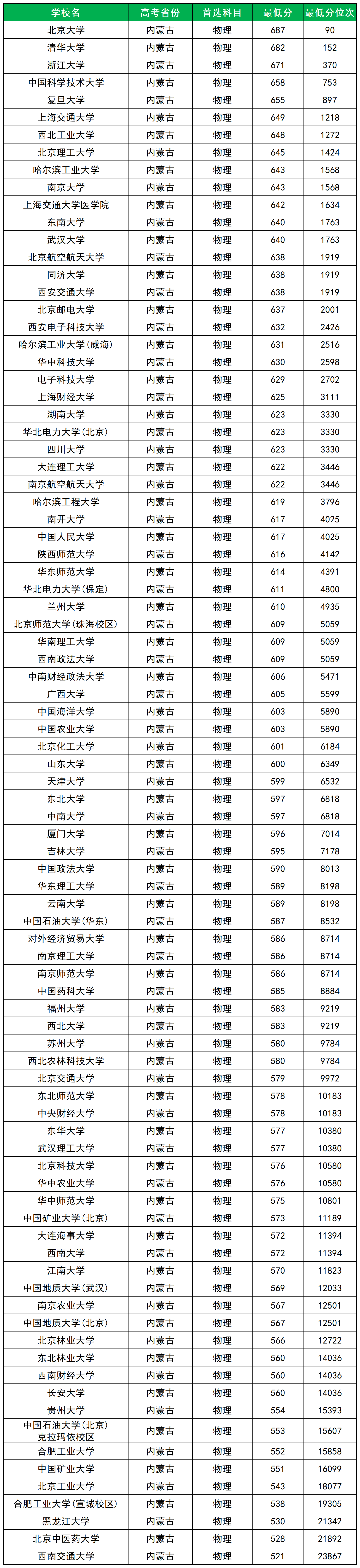 收分最高的院校為北京大學,最低分687,對應位次90;收分最低的院校為西南交通大學,最低分521,對應位次23867。