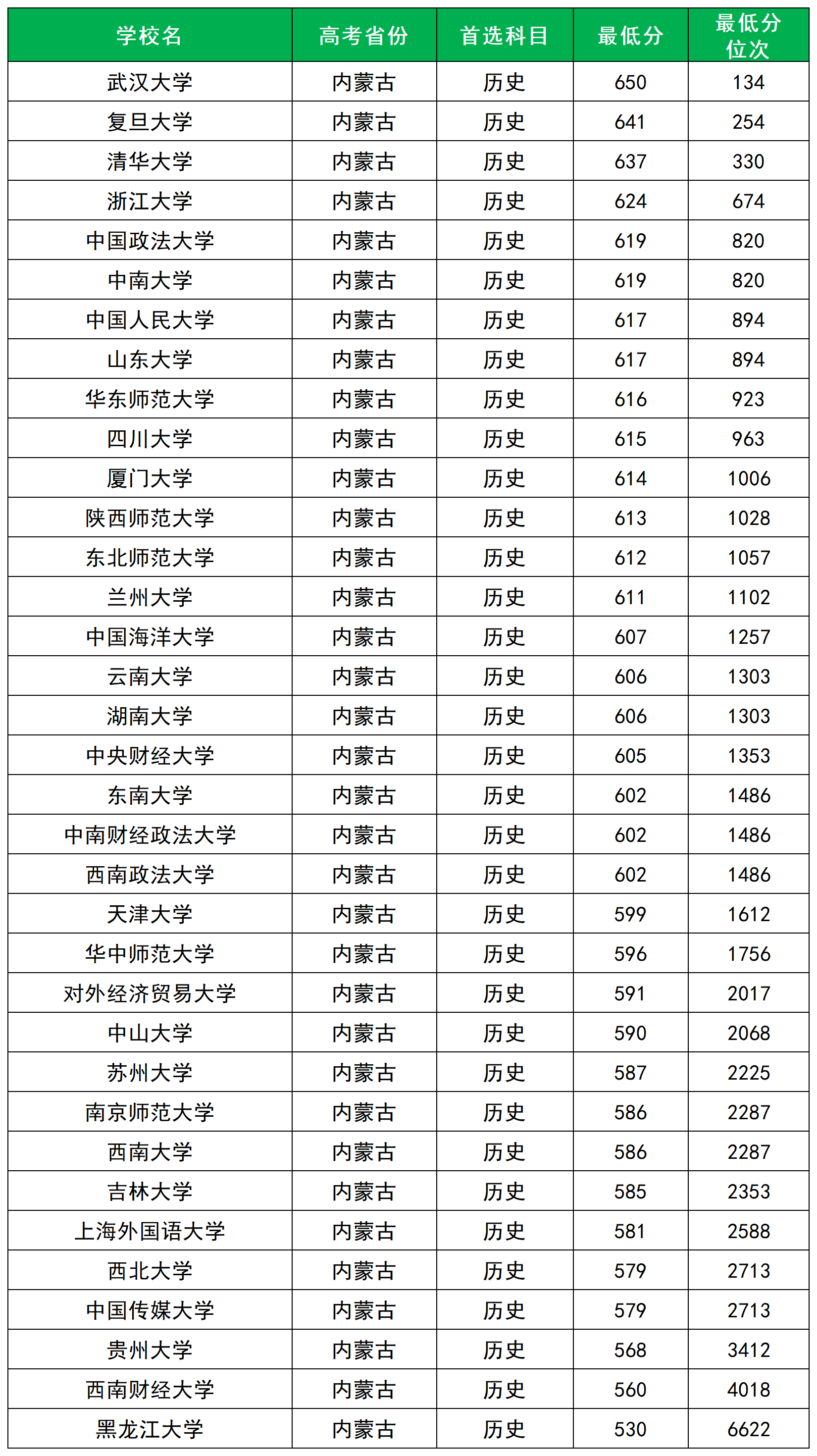 收分最高的院校為武漢大學,最低分650,對應位次134;收分最低的院校為黑龍江大學,最低分530,對應位次6622。
