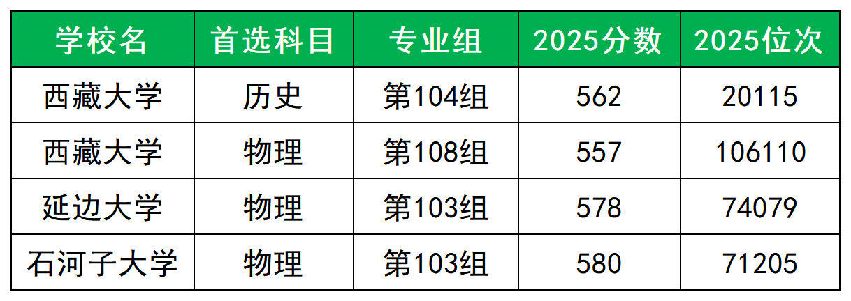 歷史組:新疆大學(571分)、西藏大學(575分)、延邊大學(576分)等;