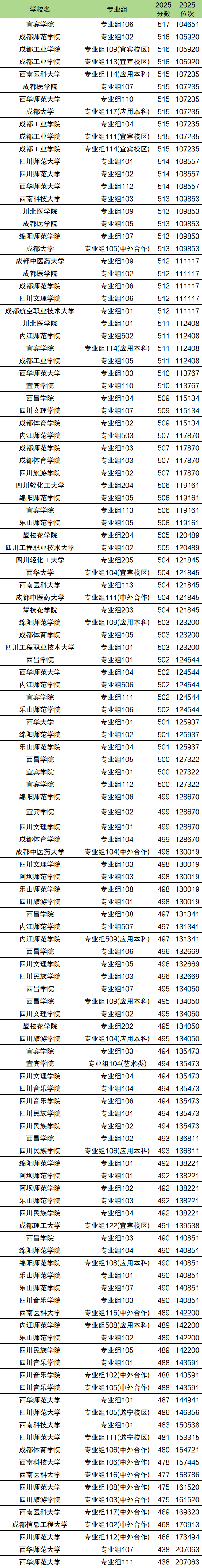 分數(shù)線最高的是宜賓學院106組,2025年最低分517分,該校屬于綜合類,入選雙萬計劃,對應招生專業(yè)為英語。分數(shù)線最低的是西華師范大學111組,2025年最低分438分,剛過本科線,該校屬于師范類,屬于省重點,對應招生專業(yè)為生物科學、生物技術(shù)、生態(tài)學。