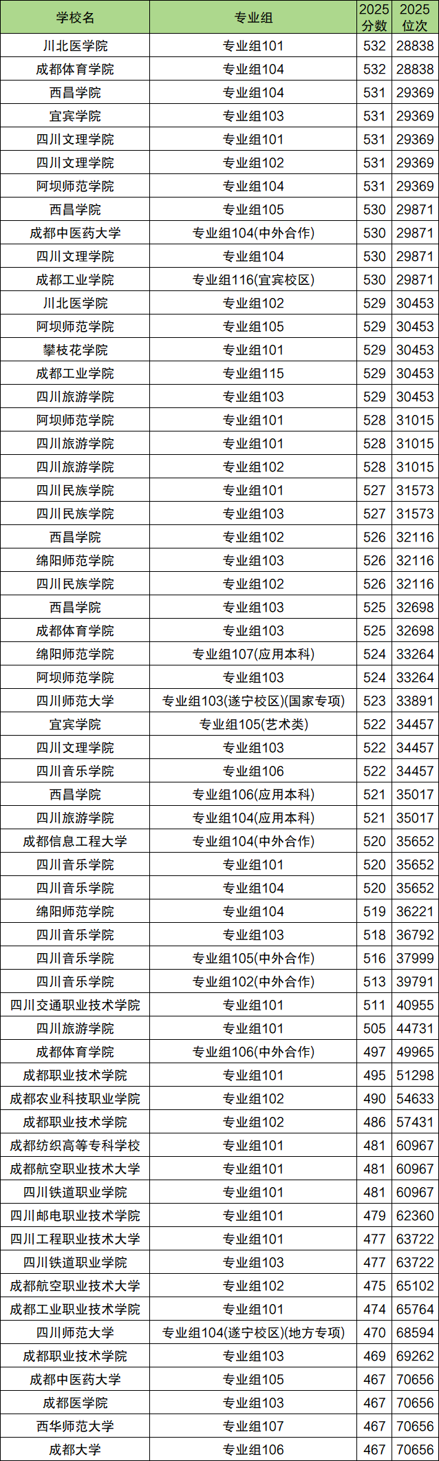 四川公辦二本大學分數(shù)線多數(shù)位于480分到520分,中外合作專業(yè)組中分數(shù)線最低的是成都體育學院106組,2025年最低分497分,對應位次49965名。
