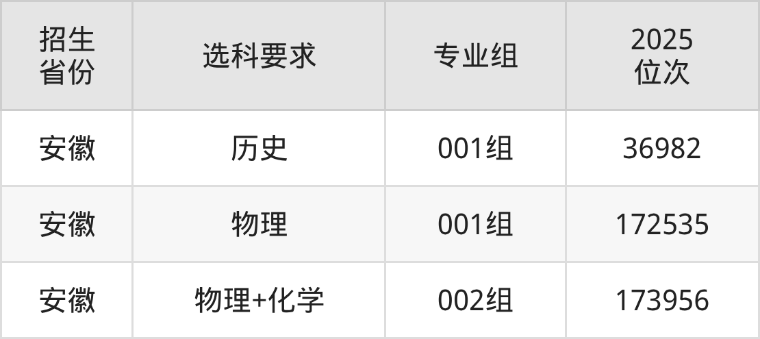 合肥經(jīng)濟學(xué)院2025年的位次差異較大,最高位次是36982位(安徽歷史類)、最低位次是173956位(安徽物理類)。具體位次請看下圖: