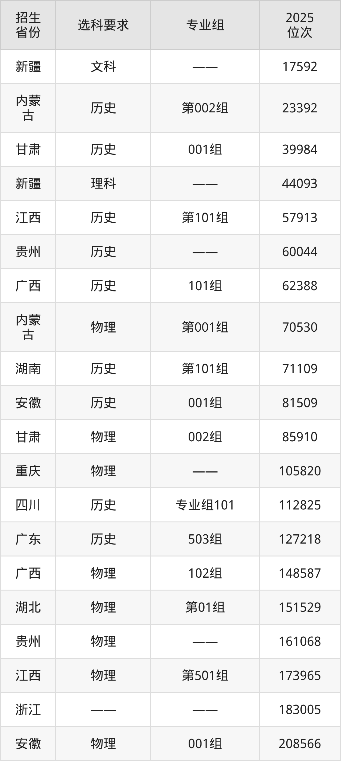 湖南信息職業(yè)技術(shù)學(xué)院2025年在全國(guó)各省的位次差異較大,最高位次是17592位(新疆文科)、最低位次是255120位(廣東物理類(lèi))。各省具體位次請(qǐng)看下圖: