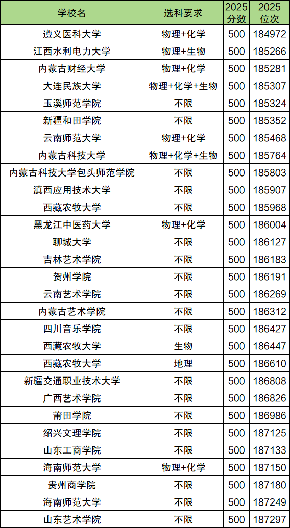 山東高考500分最低錄取位次是187297名,對應(yīng)能上的學校有云南師范大學、聊城大學、吉林藝術(shù)學院、四川音樂學院、遵義醫(yī)科大學等,具體名單如下表所示: