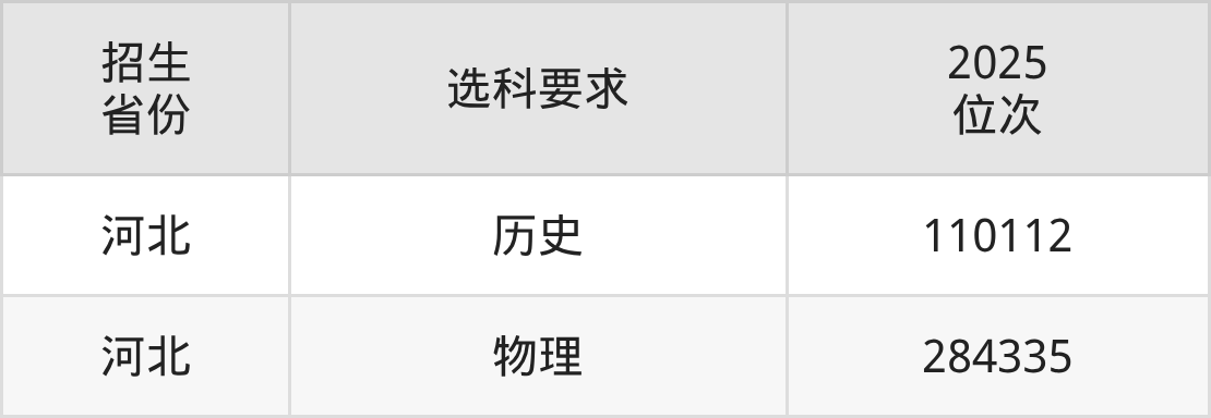 北京體育職業(yè)學(xué)院2025年的位次差異較大,最高位次是110112位(河北歷史類)、最低位次是284335位(河北物理類)。具體位次請看下圖: