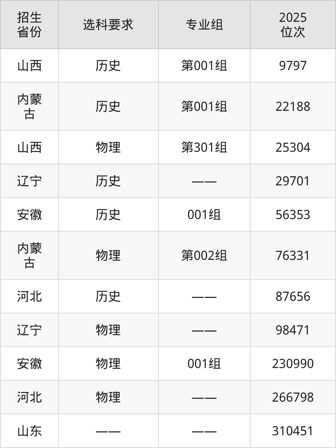 北京政法職業(yè)學(xué)院2025年在全國(guó)各省的位次差異較大,最高位次是9797位(山西歷史類(lèi))、最低位次是310451位(山東)。各省具體位次請(qǐng)看下圖:
