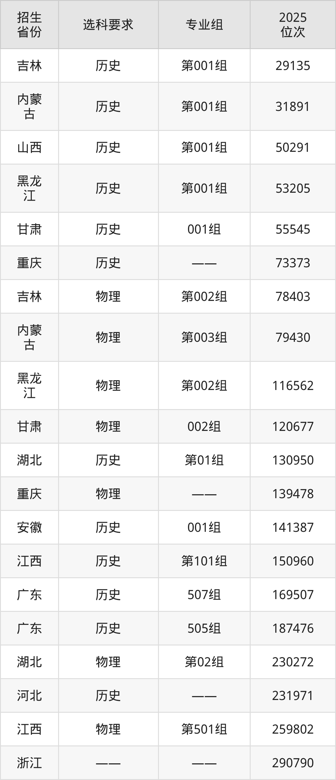 景德鎮(zhèn)陶瓷職業(yè)技術(shù)學(xué)院2025年在全國各省的位次差異較大,最高位次是29135位(吉林歷史類)、最低位次是677166位(山東)。各省具體位次請(qǐng)看下圖: