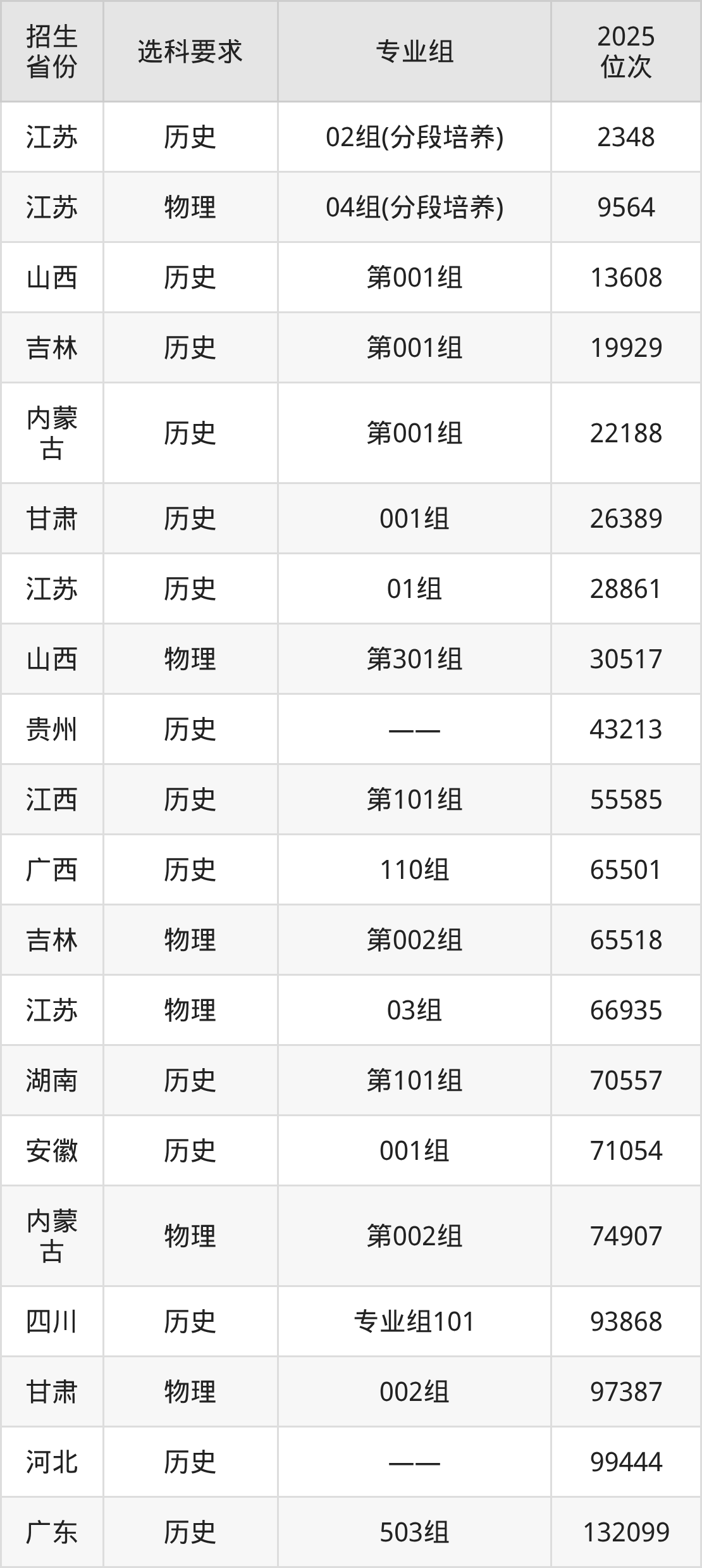 江蘇財經(jīng)職業(yè)技術(shù)學(xué)院2025年在全國各省的位次差異較大,最高位次是2348位(江蘇歷史類)、最低位次是345250位(山東)。各省具體位次請看下圖: