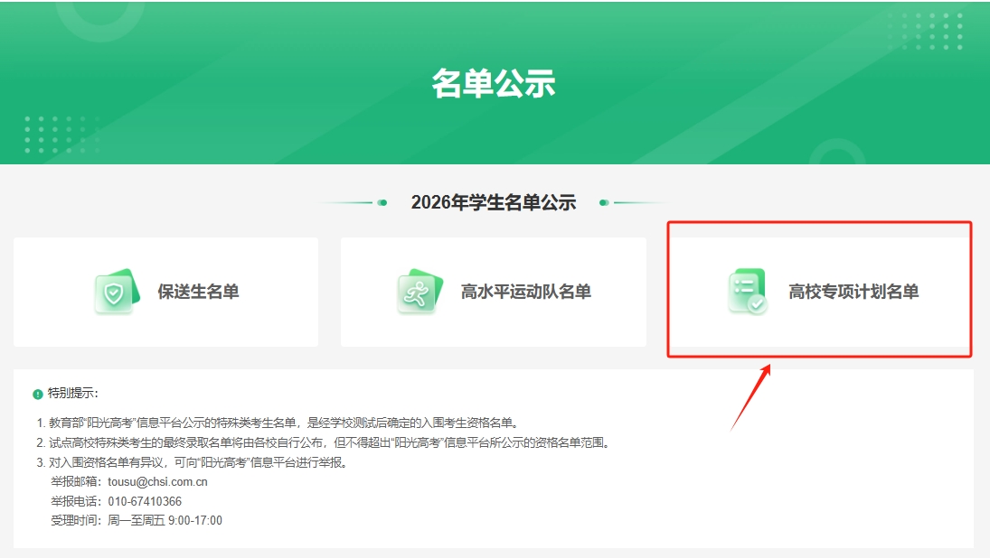 二、2026陽(yáng)光高考網(wǎng)高校專項(xiàng)計(jì)劃名單公示時(shí)間