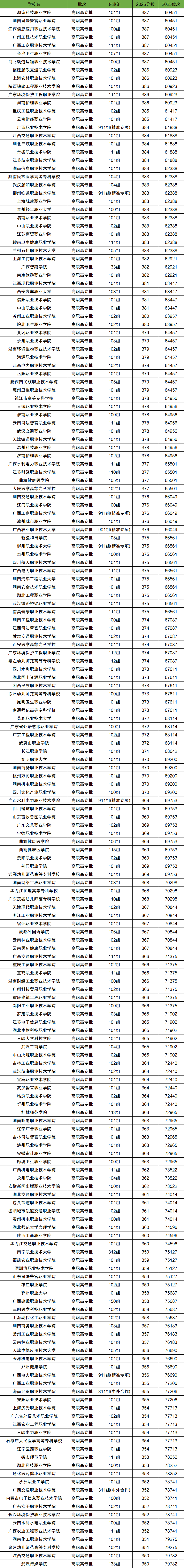 廣西壯族自治區(qū)高考6萬名~8萬名中收分最高的是湖南科技職業(yè)學(xué)院、湖南司法警官職業(yè)學(xué)院、江西信息應(yīng)用職業(yè)技術(shù)學(xué)院,在廣西壯族自治區(qū)錄取位次均為60451,對應(yīng)分數(shù)均為387分。